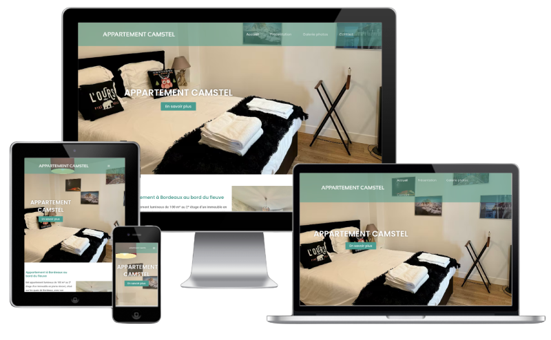 Pour l’Appartement Camstel, un spacieux appartement meublé de 100 m² situé sur les quais de Bordeaux, dédié à la location touristique de courte ou moyenne durée, j’ai créé le site web entièrement avec des outils 100% gratuits afin d’optimiser le budget du client.